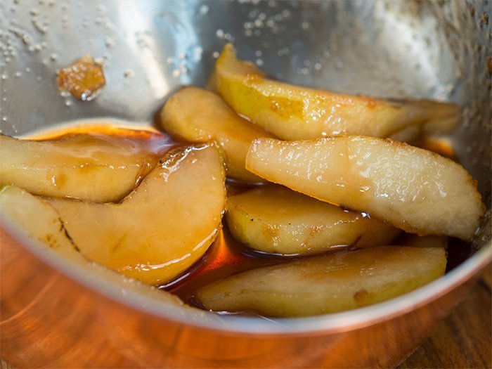 «Груши всегда привлекали меня своими вкусовыми свойствами. Честно признаюсь, что млею я от груш из наших садов в летнее время, а сортов столько, что не упомнишь. Все они очень сочные, с кисло-сладким слегка вяжущим на вкус от высокой концентрации сладости соком. Одно плохо в этих грушах, что период их употребления очень короток 3-5 дней после того как их сорвали с веток дерева, а дальше мякоть чудесного плода превращается в «картофельный» … и есть её уже не приятно. Обычно в сёлах такие плоды отдавали животным на корм. Мы с супругой попали случайно в один из киевских маркетов, где на прилавок выложили немного, около двух кг груш, очевидно где-то задержавшихся … сорт зимний и расположенный к длительному хранению, импортный, но уже на подходе к окончанию срока реализации. Мы купили три груши и к ним, за неимением сливок в продаже пакет 25% сметаны. Ибо как я буду готовить их я придумал сразу.Дома по прибытию я груши помыл, очистил от кожуры, разрезал на четверти и удалил косточки. На сковороду выложил столовую ложку сливочного масла и разогрев обжарил до легкой розовой корочки мякоть четвертинок груши. Дальше посыпал тремя столовыми ложками жарящиеся груши сахаром, добавив немного воды (3 столовых ложки) и немного корицы. Помешивая время от времени и поливая четвертинки груш создавшимся сиропом хорошо бланшировал до карамелизации. Сметану выложил в миску, несколько капель лимонного сока, немного загустителя для сливок (если нет, можно немного крахмала) добавил и сахарной пудры.Взбивать начал без сахарной пудры и когда сметана начала слегка густеть понемногу начал добавлять сахарную пудру. Я не люблю очень сладкие сливки, а чтобы слегка и с кислинкой, поэтому мне хватает неполная столовая ложка пудры. Взбилось превосходно. Вечером, под бокал красного вина мы наслаждались, и пили за нашу победу».