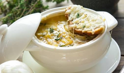 Луковый суп был известен издревле, причём популярен он был в основном в бедных семьях. Где-то в 18 веке он был доведен до совершенства французами – а они умеют делать шедевры из простых блюд! Суп невероятно приятный, густовато-насыщенный, с переплетающимся сладковатым вкусом лука и терпкого тимьяна, всё это дополняется плавленым сыром с кусочками хрустящих гренок. Богатый вкус супа основан на пассерованом луке. Это кропотливая процедура, при которой лук медленно обжариваясь, становится золотисто-коричневым. Этот процесс называется «карамелизацией»: сахар, содержащийся в луке при обжарке превращается в карамель – отсюда и золотистый цвет.